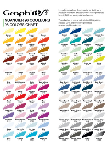• Tabela de 96 cores Graph'it com nomes e códigos num fundo branco