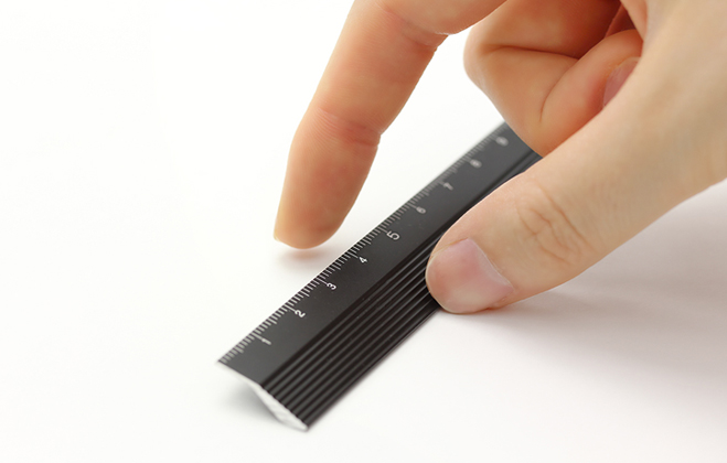 • Régua preta com marcações brancas e mão a segurá-la sobre superfície branca