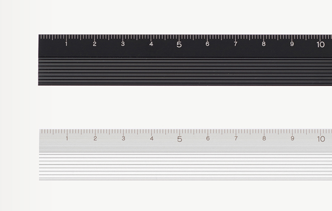 • Duas réguas metálicas, uma branca e outra preta, com marcações em cm, em fundo branco e texto GOOD DESIGN AWARD 2013.