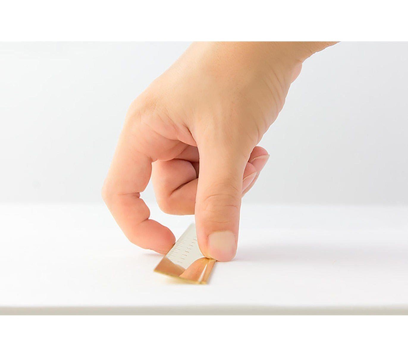 Régua de latão de 15 cm com escala  gravada a laser para durar ao longo do tempo. Um lado da régua é inclinado para facilitar o transporte e o desenho de linhas. Á medida que o latão é oxidado, pode aparecer patina (uma forma de ferrugem). No entanto, esta não é uma substância tóxica, e usando um polidor de metal, é possível restaurar o brilho original.
